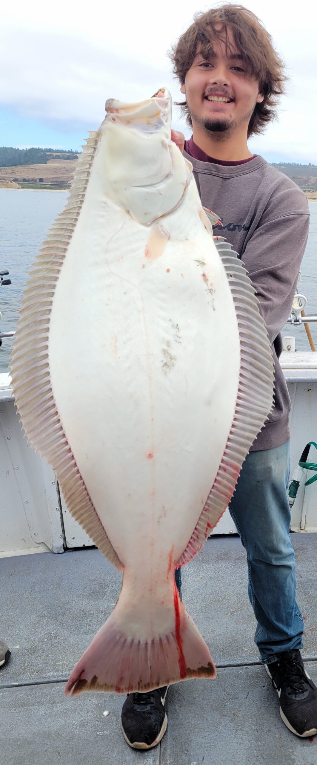 Great day on the water for our Jurassic Park trip. Our guests came in from Fresno escaping 100-degree weather and fished in 65-degree weather all day. The fishing was really good today with four limits of nice rock cod, five ling cod, and one fat 30-pound halibut! The halibut took a while to land, and we all thought after ten minutes of battle it was a big shark. Nope, just a really big halibut. Our biggest of the season.
